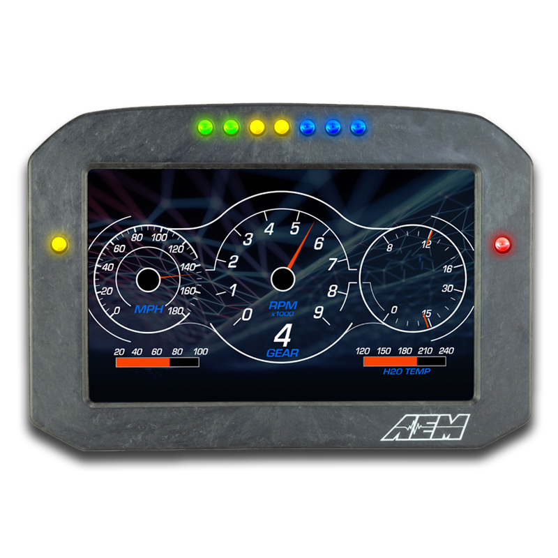 The CD-7F Carbon receives channels from CAN bus inputs and it does not require special modules to read AEM EV and/or 3rd-party CAN signals. The bus configuration and messages are fully configurable; it even supports indexed messages. Custom CAN configurations can be imported via industry standard DBC files or the user can manually enter each message and channel. The user can then rename, filter, calibrate, change units and log any CAN channel, as well as direct these channels to inputs on our pre-defined or user-created templates.