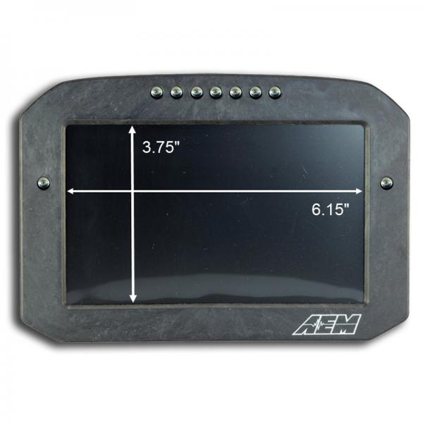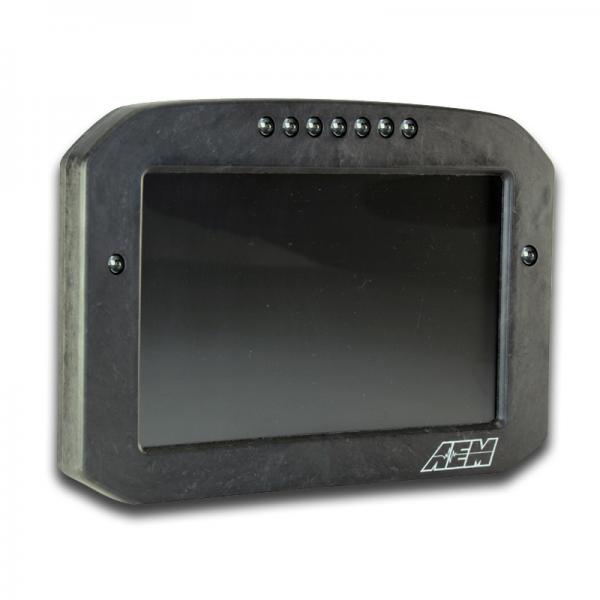 CD-7F (Flat Panel) Carbon Digital Dash Displays feature a full-color, daylight readable screen surrounded by a tough, lightweight flow-molded carbon fiber composite housing. Seven ultra-bright LEDs span the top of the display housing for RPM and shift light indication. Users can program them to ascend in specific increments based on RPM range and flash when it is time to shift. Brightness is user programmable on the fixed color LEDs. Remote button functions are included in the supplied rear connector, allowing easy page changing and memory resetting even with driving gloves on. Two additional programmable LEDs are located on the top of the housing on either side of the integrated LED shift lights.