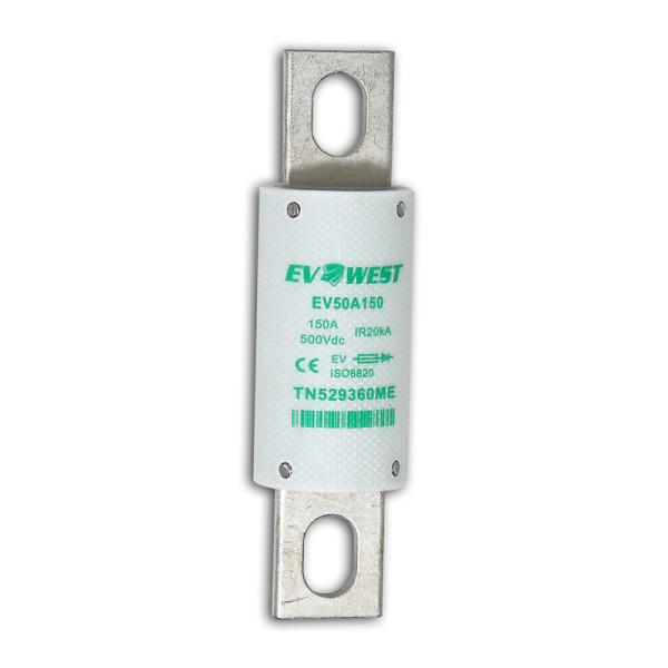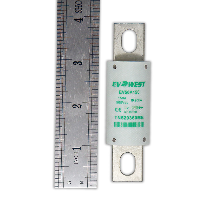 Our EV West fuse is good up to 500 volts, and can handle a continuous 150 amps, and a peak amperage of 200 amps. This is a replacement for the Tesla Smart 3kWh module on board fuse. This fuse fits our Size 3 fuse holder found here: