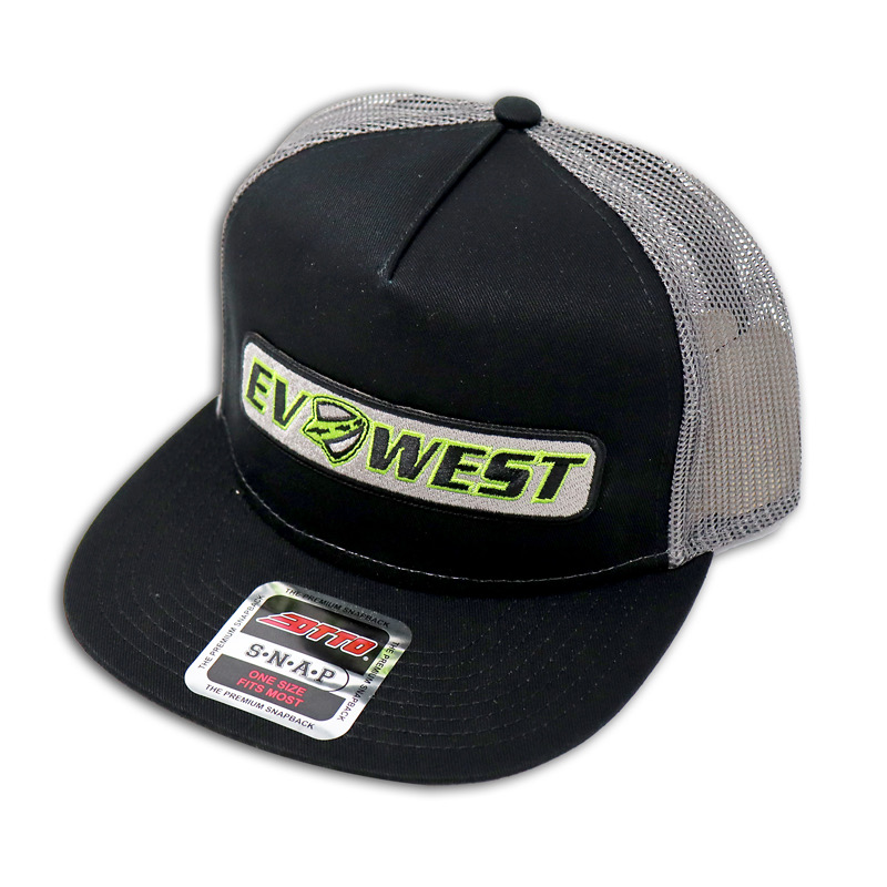 Express yourself in this snap back trucker hat, black on grey. One size fits all.